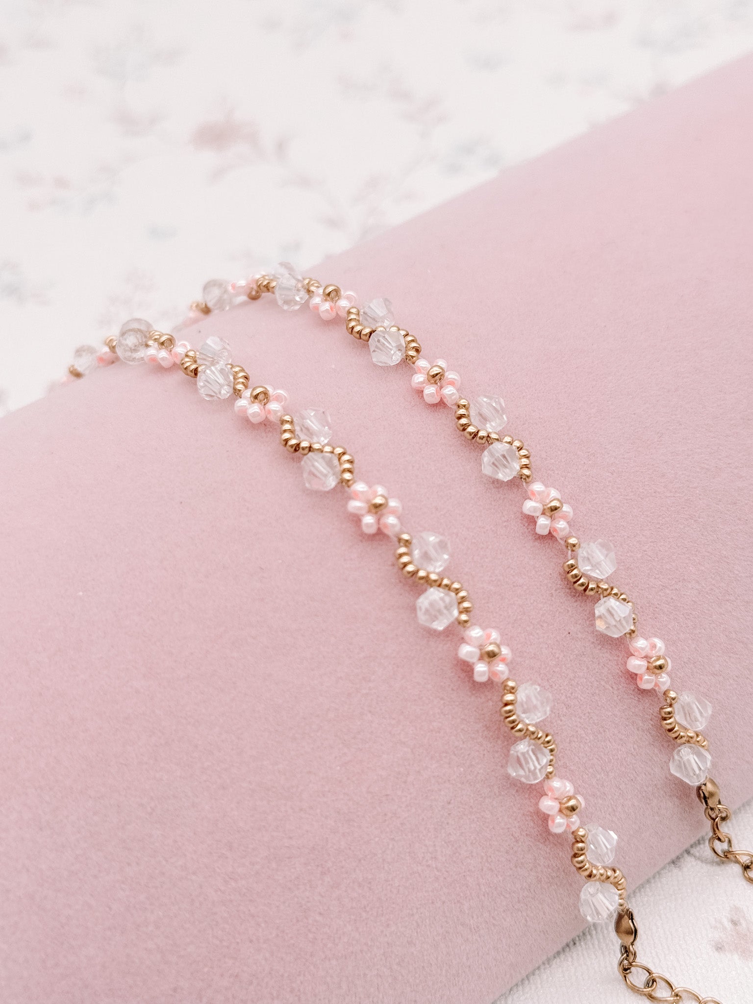 Il bracciale Aurora è un gioiello fatto a mano delicato e luminoso, realizzato con perle giapponesi di alta qualità sulle tonalità del rosa impreziosito da cristalli trasparenti su base oro.