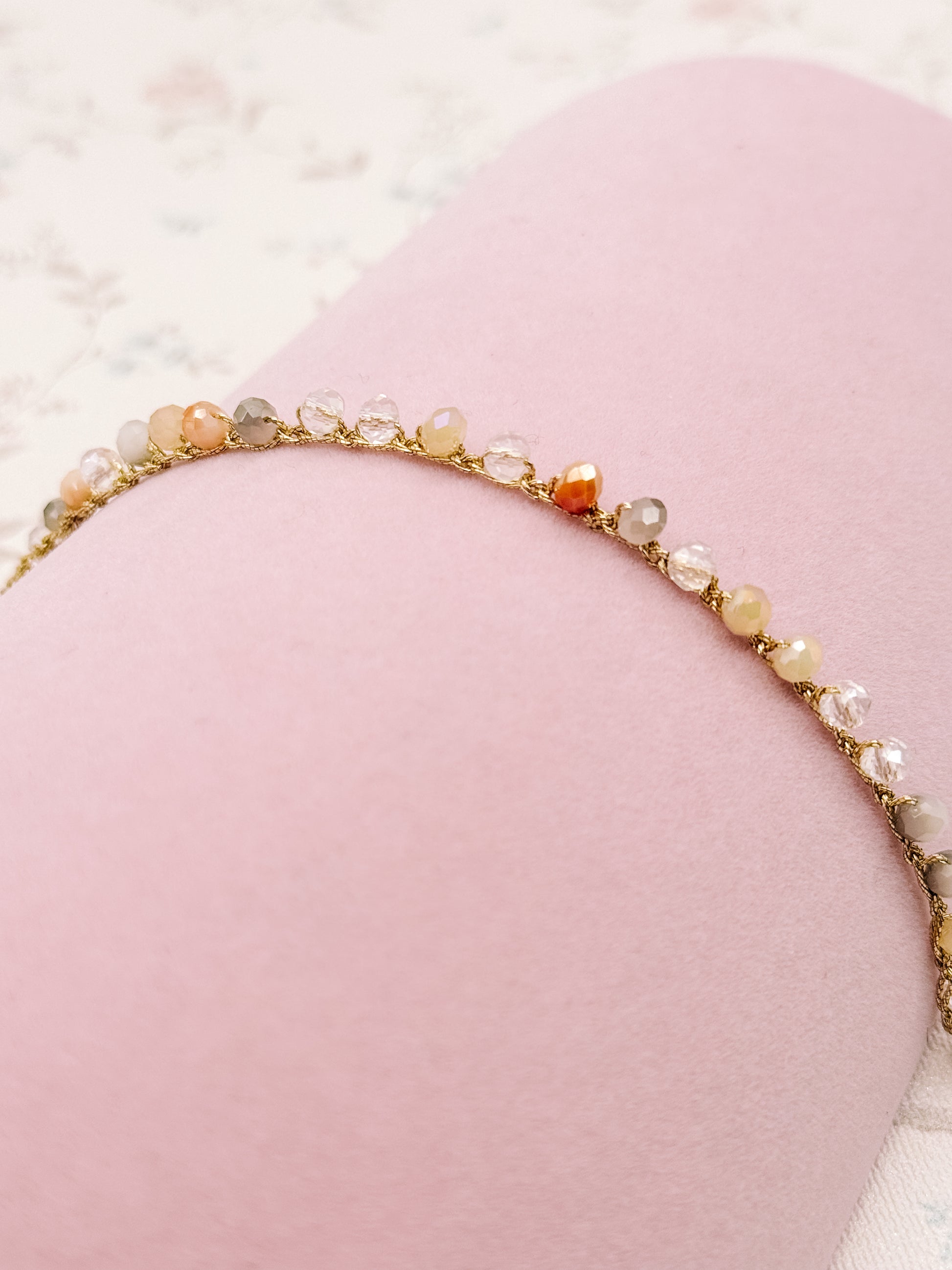 Il bracciale Clarissa è un gioiello delicato e luminoso, realizzato interamente all’uncinetto con cura artigianale. È impreziosita da cristalli che donano luce e raffinatezza.