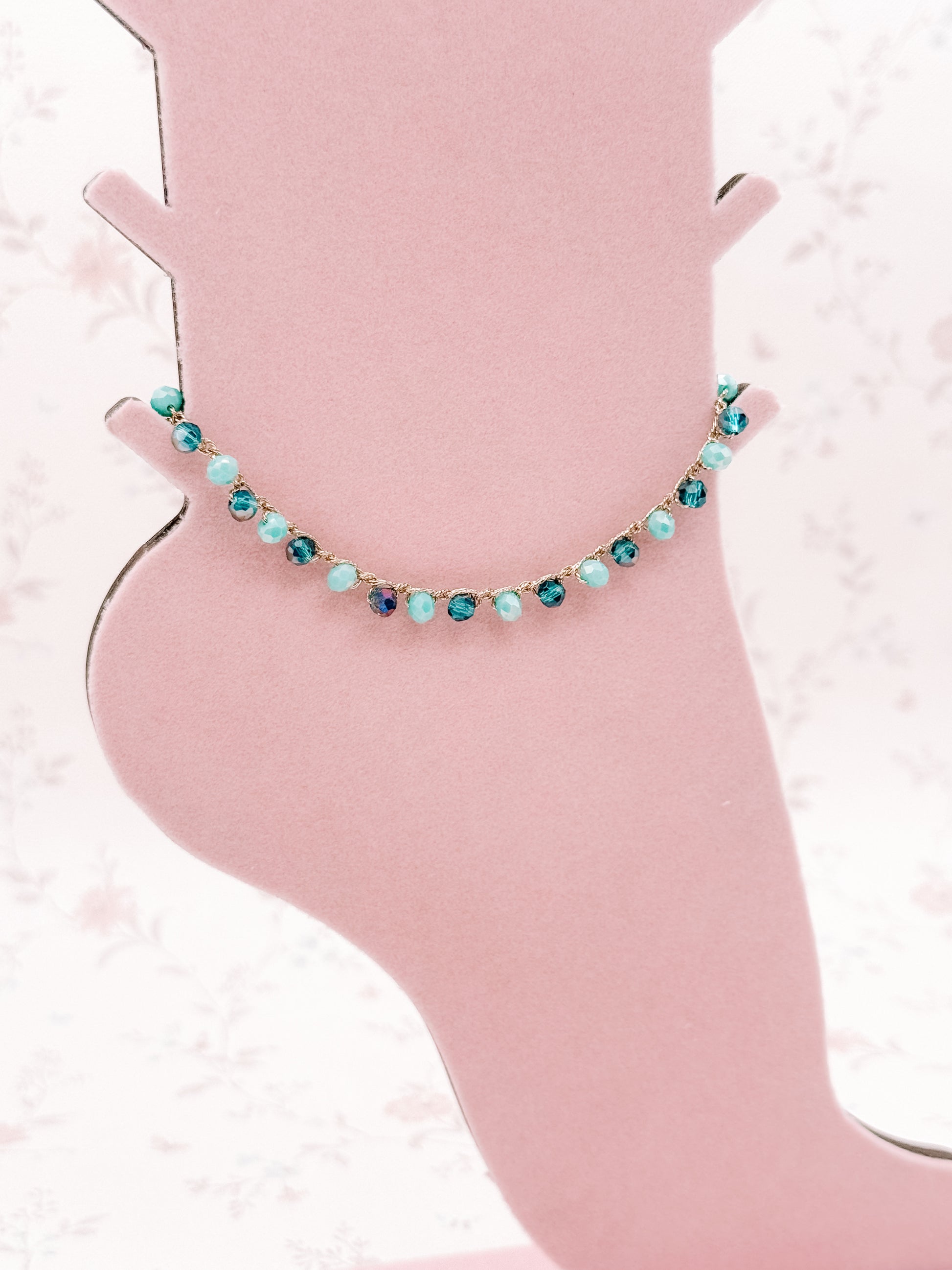 La cavigliera Maddalena è un gioiello delicato e luminoso, realizzato interamente all’uncinetto con cura artigianale. È impreziosita da cristalli verde acqua e ottanio che donano luce e raffinatezza al collo, creando un effetto fresco e luminoso.