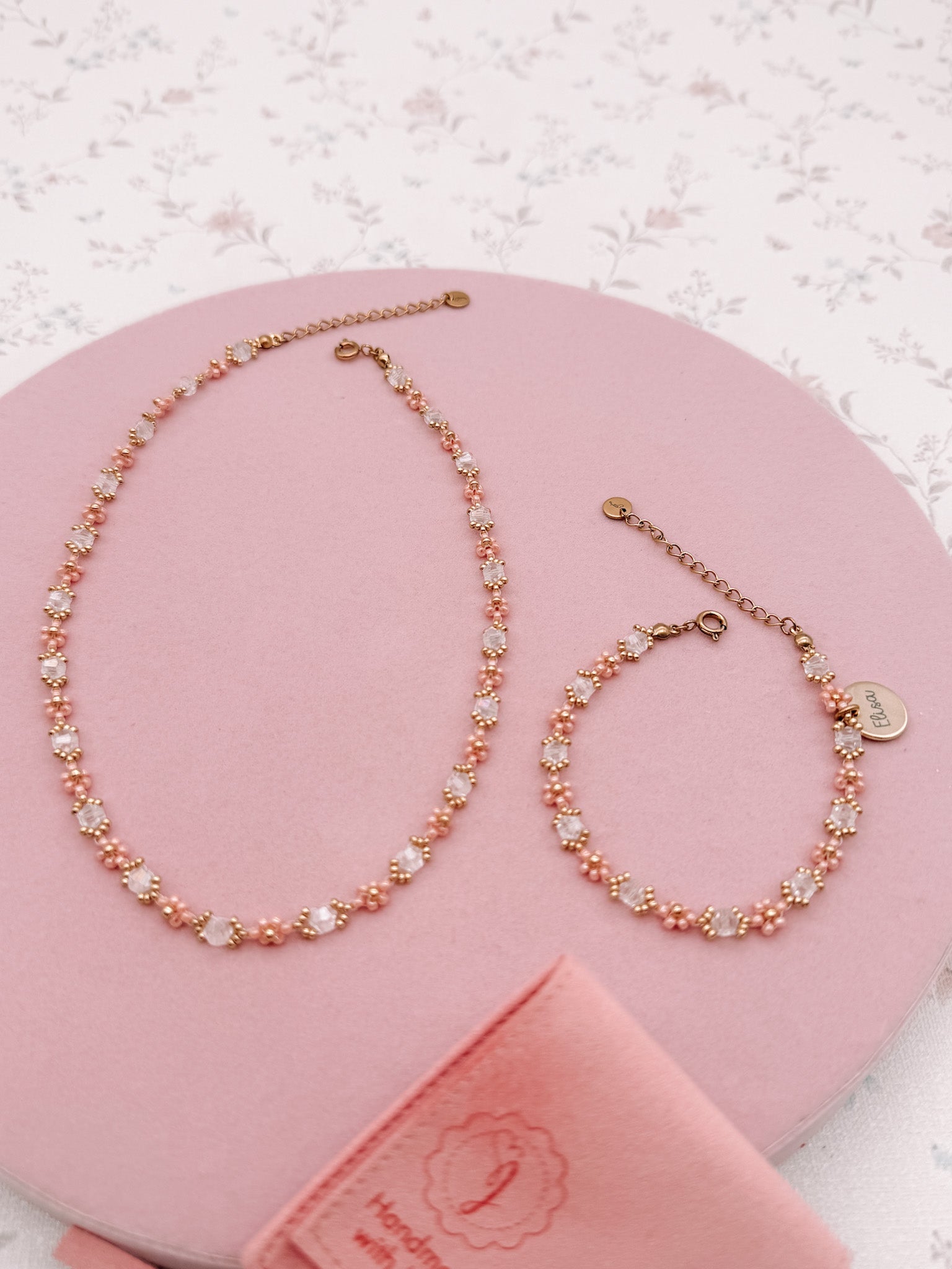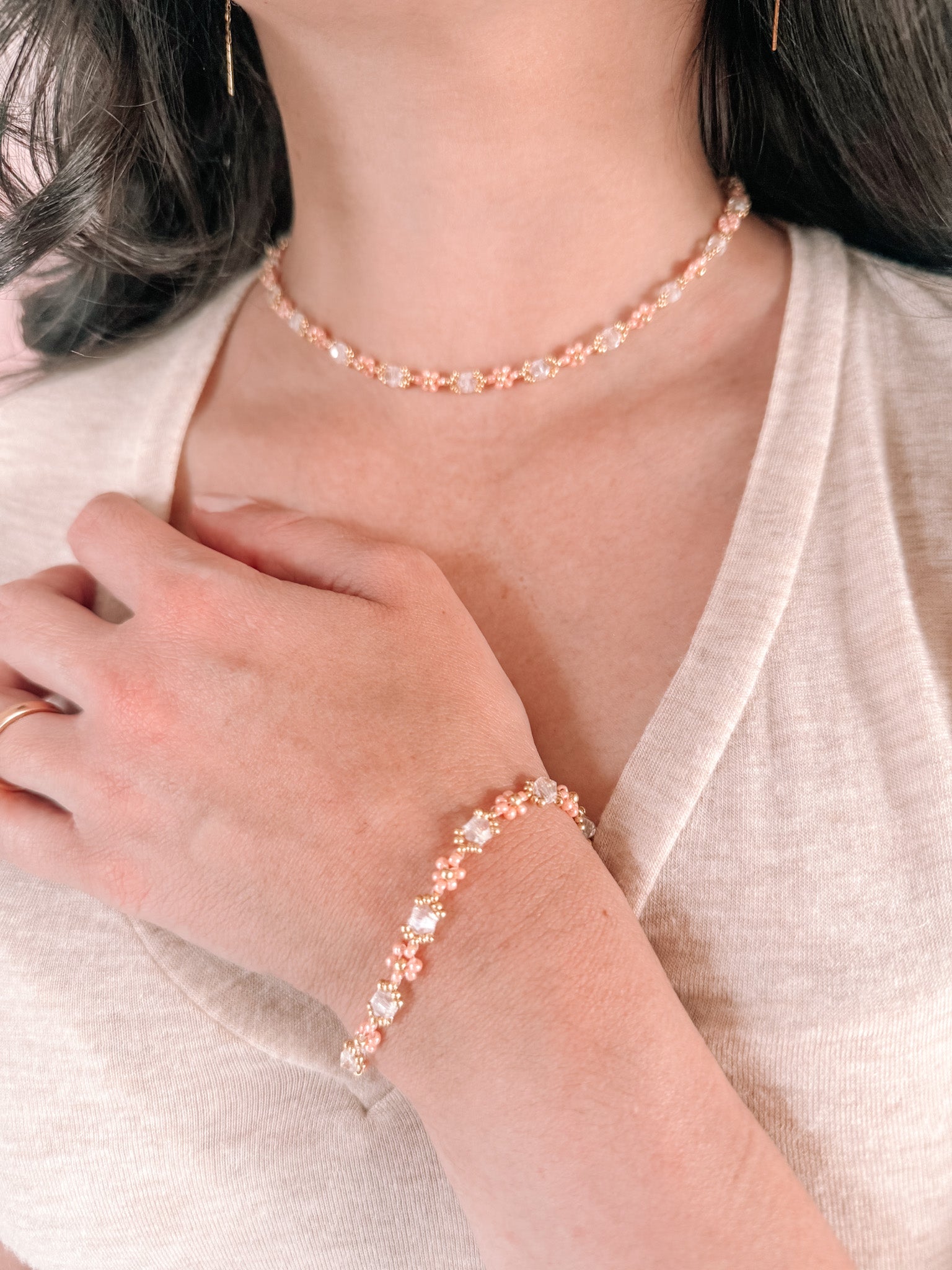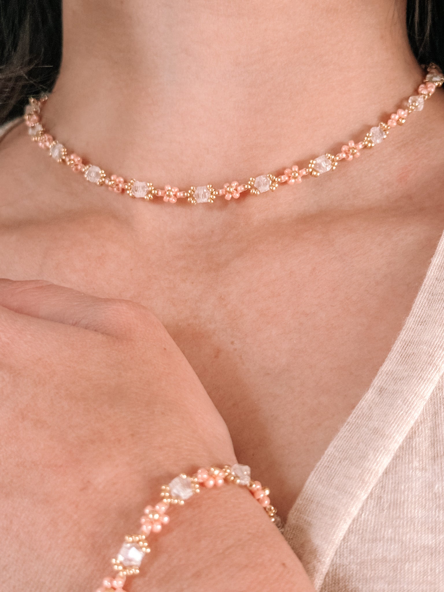 La collana Choker Sara è un gioiello fatto a mano delicato e luminoso, realizzato con perle giapponesi di alta qualità sulle tonalità del corallo chiaro impreziosito da cristalli trasparenti su base oro.