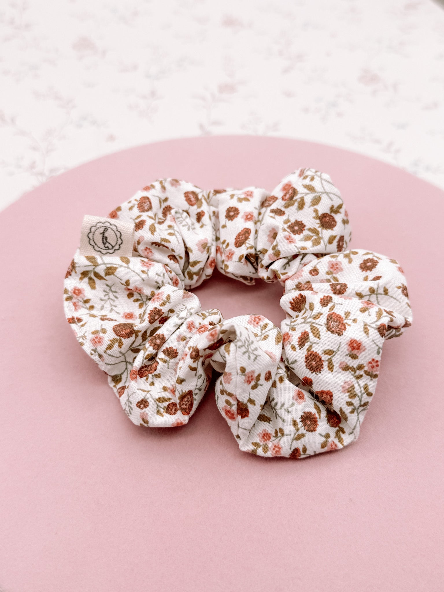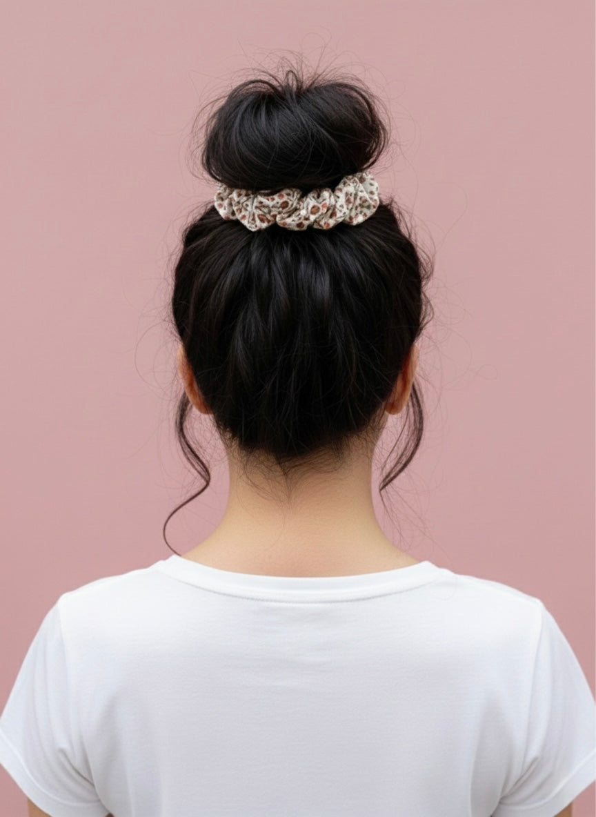 Scrunchie in morbido cotone, impreziosito da fiori neutri stilizzati per un look pulito e raffinato.